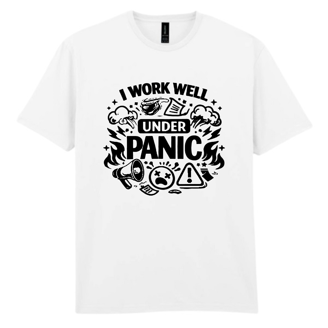 Denne t-skjorta er for deg som leverer best når det haster – når pulsen er høy og planen ble laget etter startskuddet. Med et energisk design fullt av små detaljer og tydelig typografi, er dette et plagg som både er morsomt og altfor gjenkjennelig.